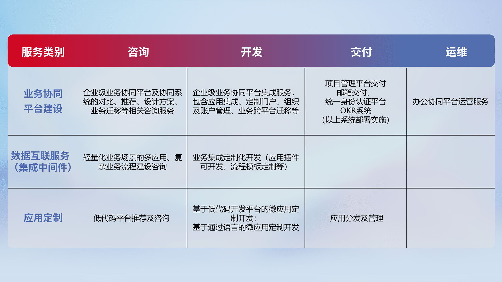 针对钉钉、、企微、、IDaas等平台级产品提供产品的规划、、、方案、、、、交付、、、、定制化开发等服务,,,,实现如统一协同办公、、、、智能客户服务、、、、混合会议管理、、智能数据查询、、、、等业务场景,,实现数字化转型。。。