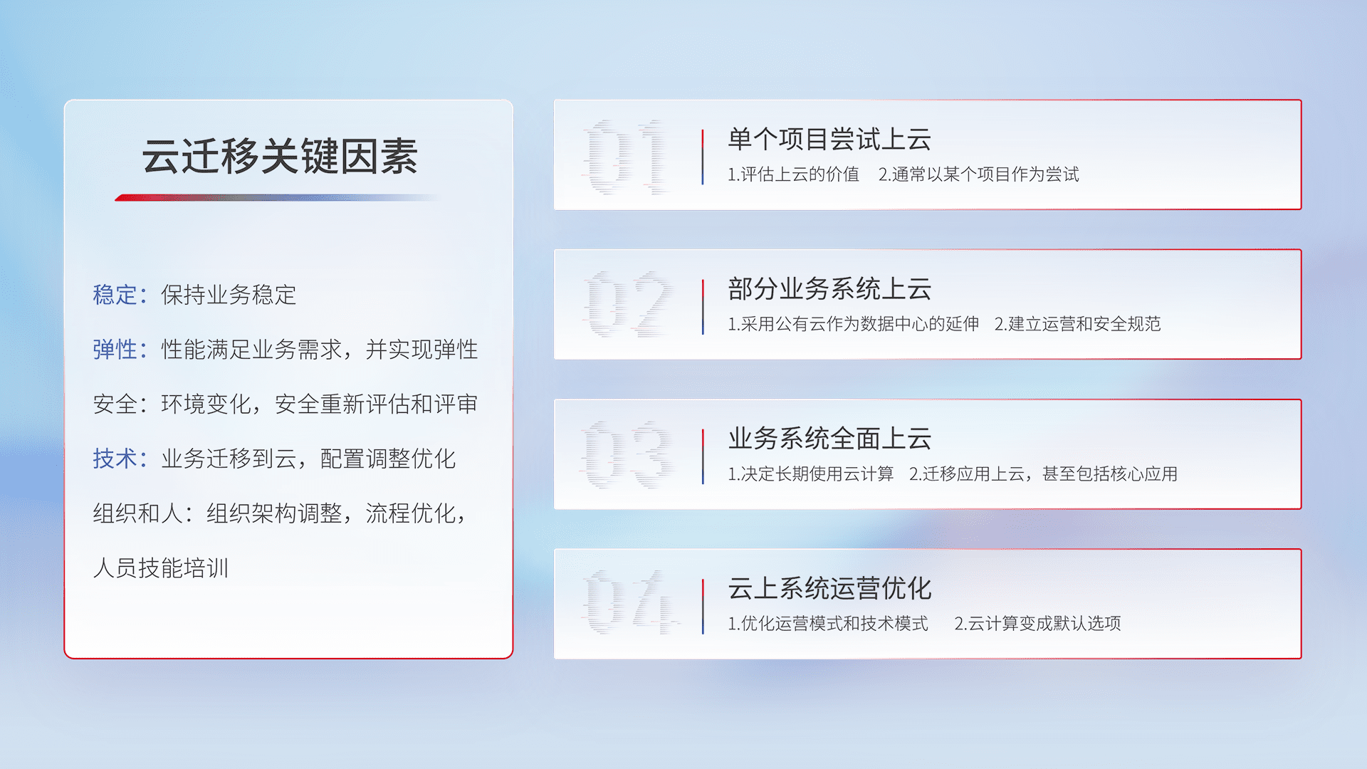 结合实际业务,,,,从规划设计、、、云平台选型、、、、云原生改造、、、数据迁移、、、集成交付,,迁移全过程为客户识别最佳上云路径,,,,做好风险识别管理,,,,设计网络架构、、、、身份权限、、、、安全审计合规、、操作审计、、、日志审计、、、监控告警策略、、、多站点容灾设计等,,对云上基础设施进行整体规划,,,提升IT治理水平,,,以满足弹性、、高可用、、高性能的需求。。